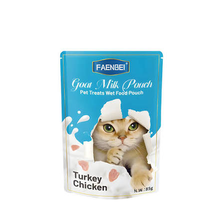خرید پوچ گربه فنبی طعم بوقلمون و مرغ در شیر بز وزن ۸۵ گرم